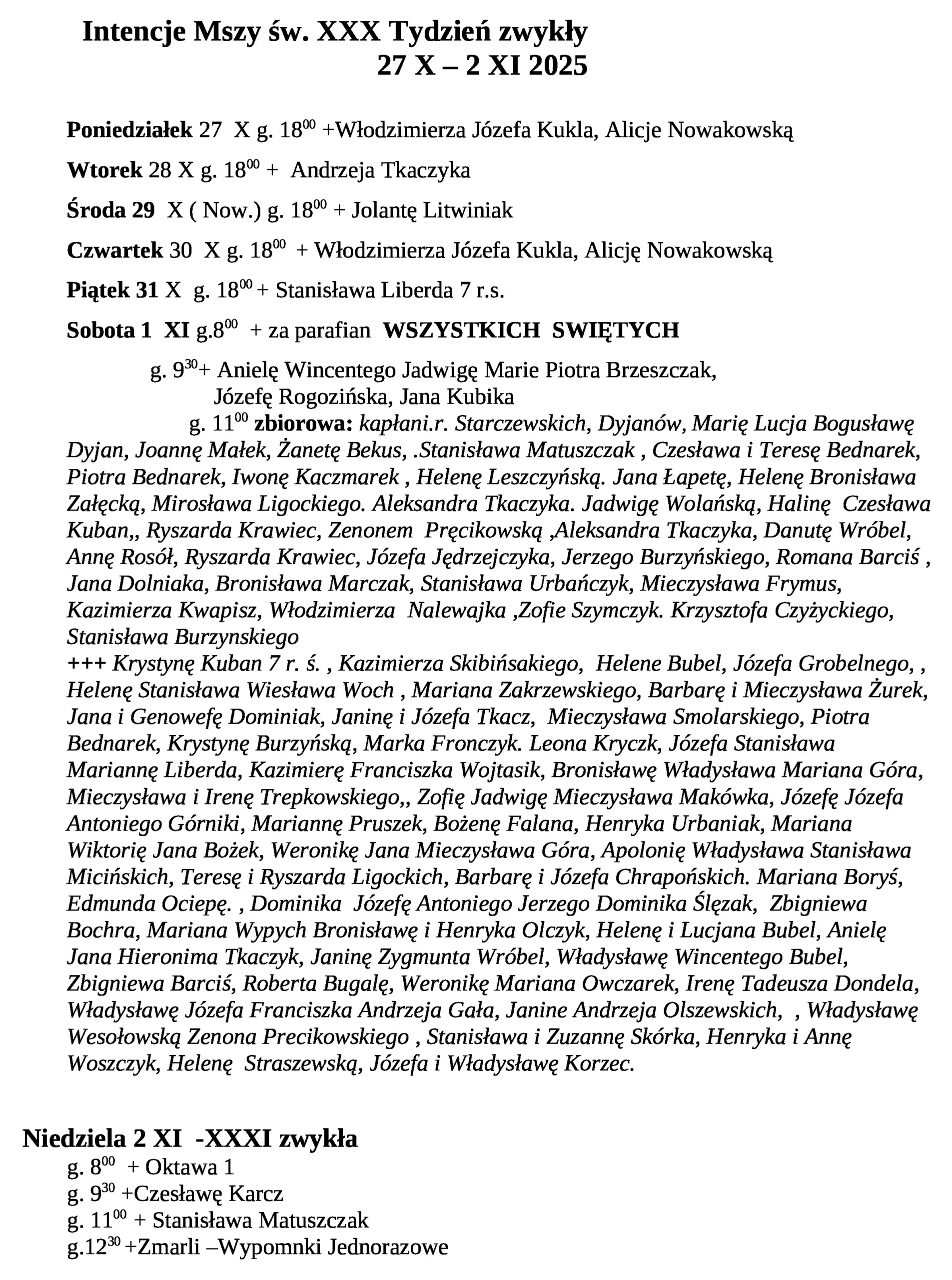 Intencje Mszy św. 27 X – 2 XI 2025