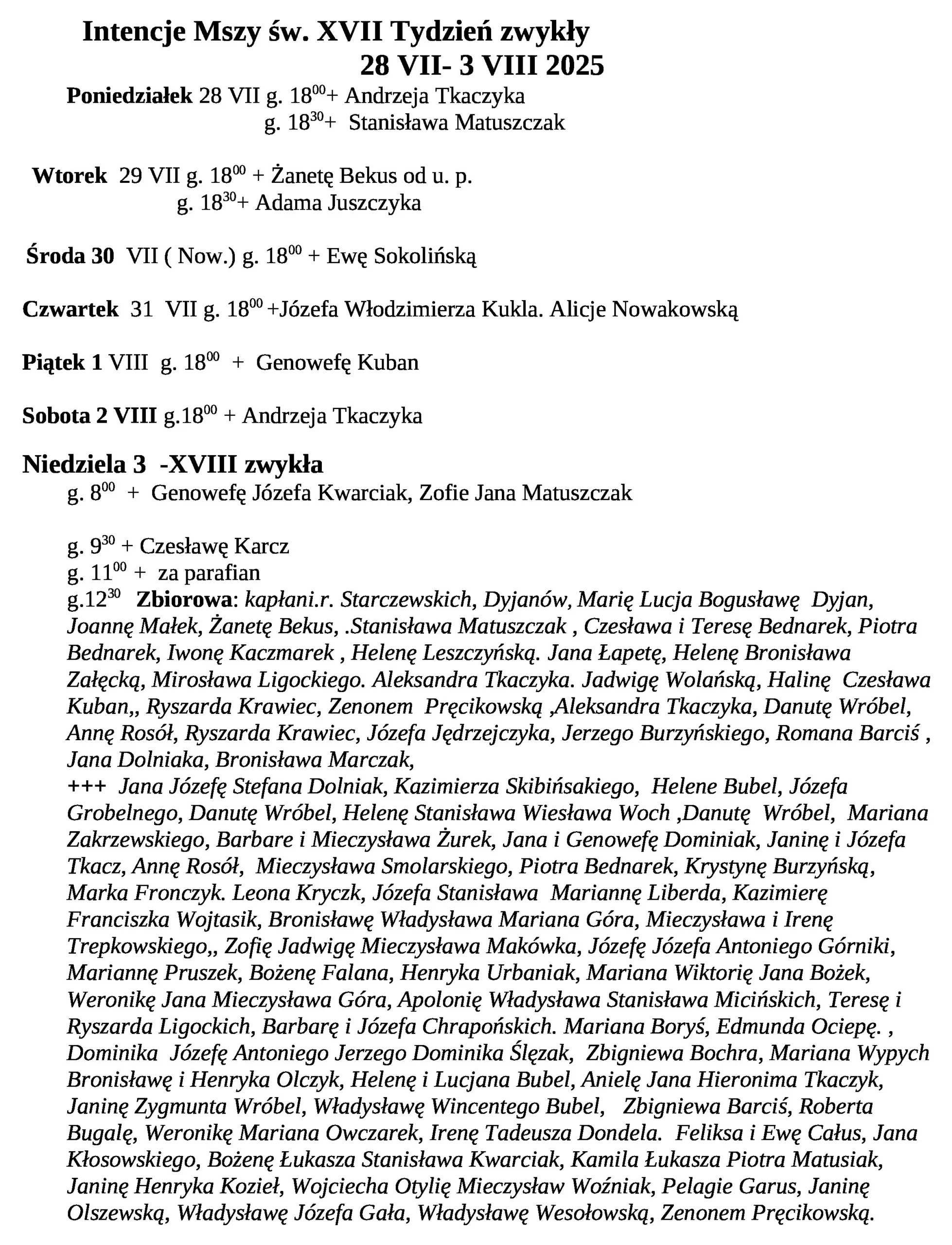Intencje Mszy św. 28 VII – 3 VIII 2025