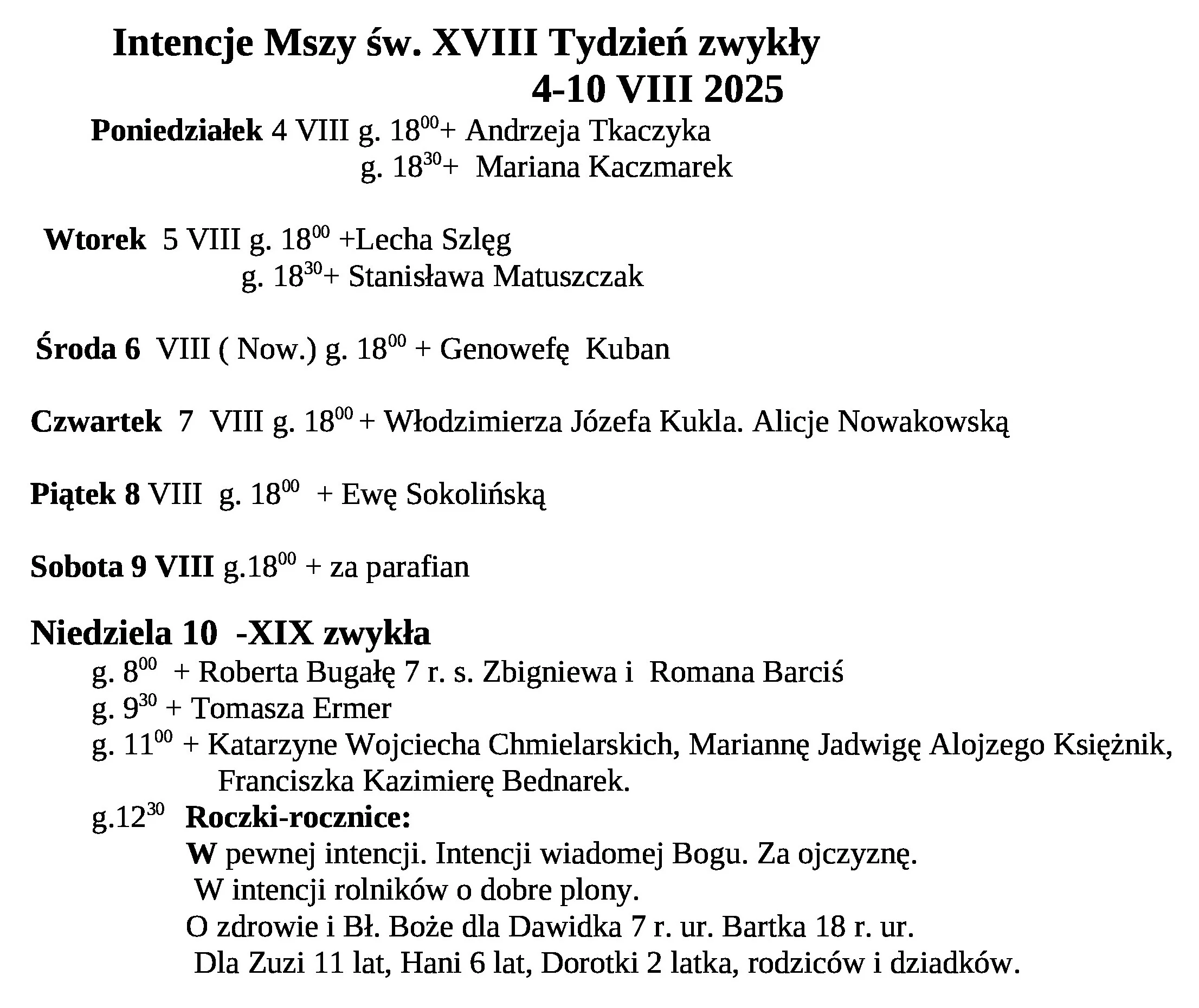 Intencje Mszy św. 4-10 VIII 2025