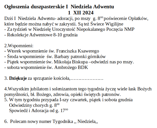 Ogłoszenia Duszpasterskie 1 XII 2024