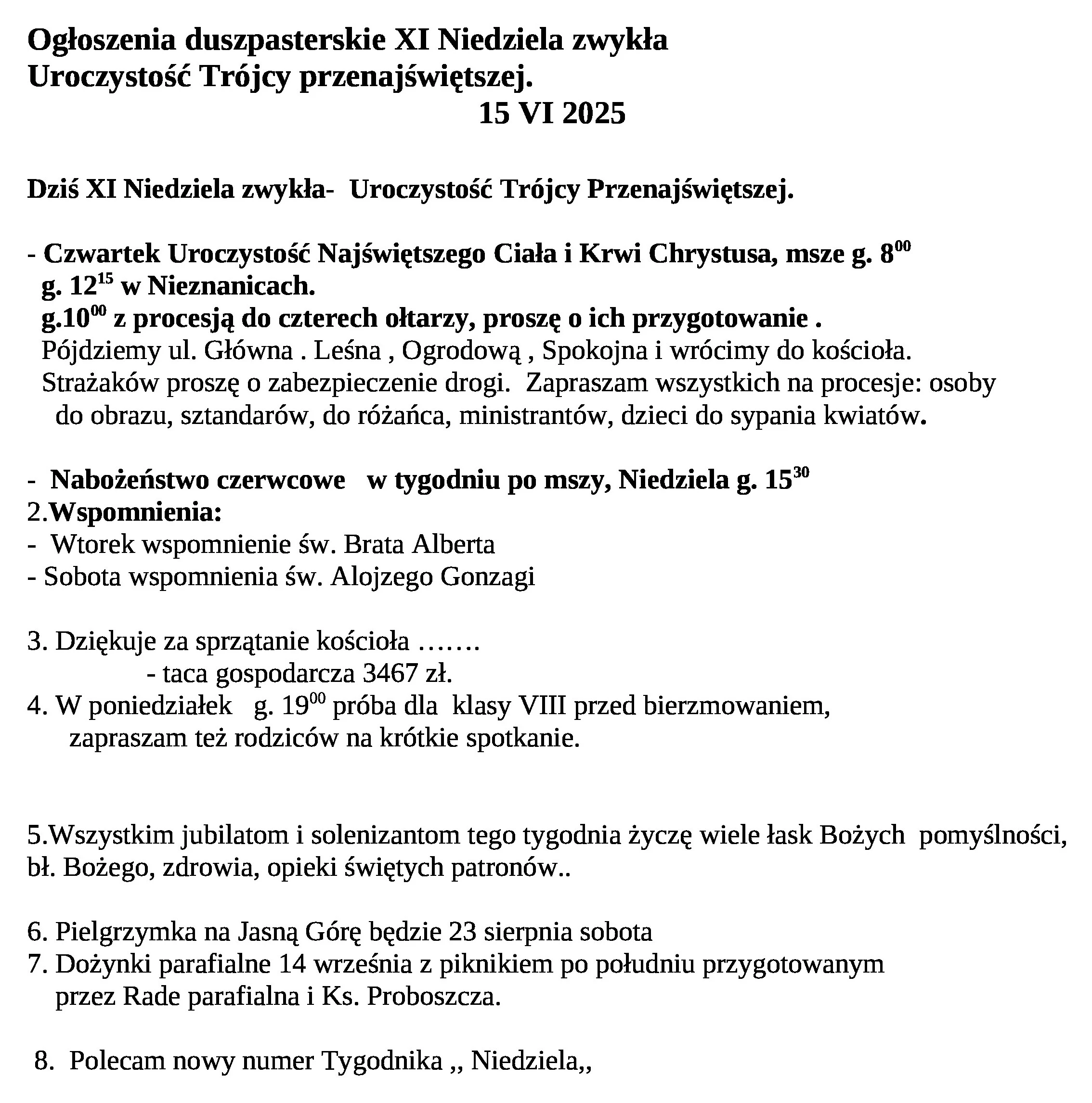 Ogłoszenia Duszpasterskie 15 czerwca 2025