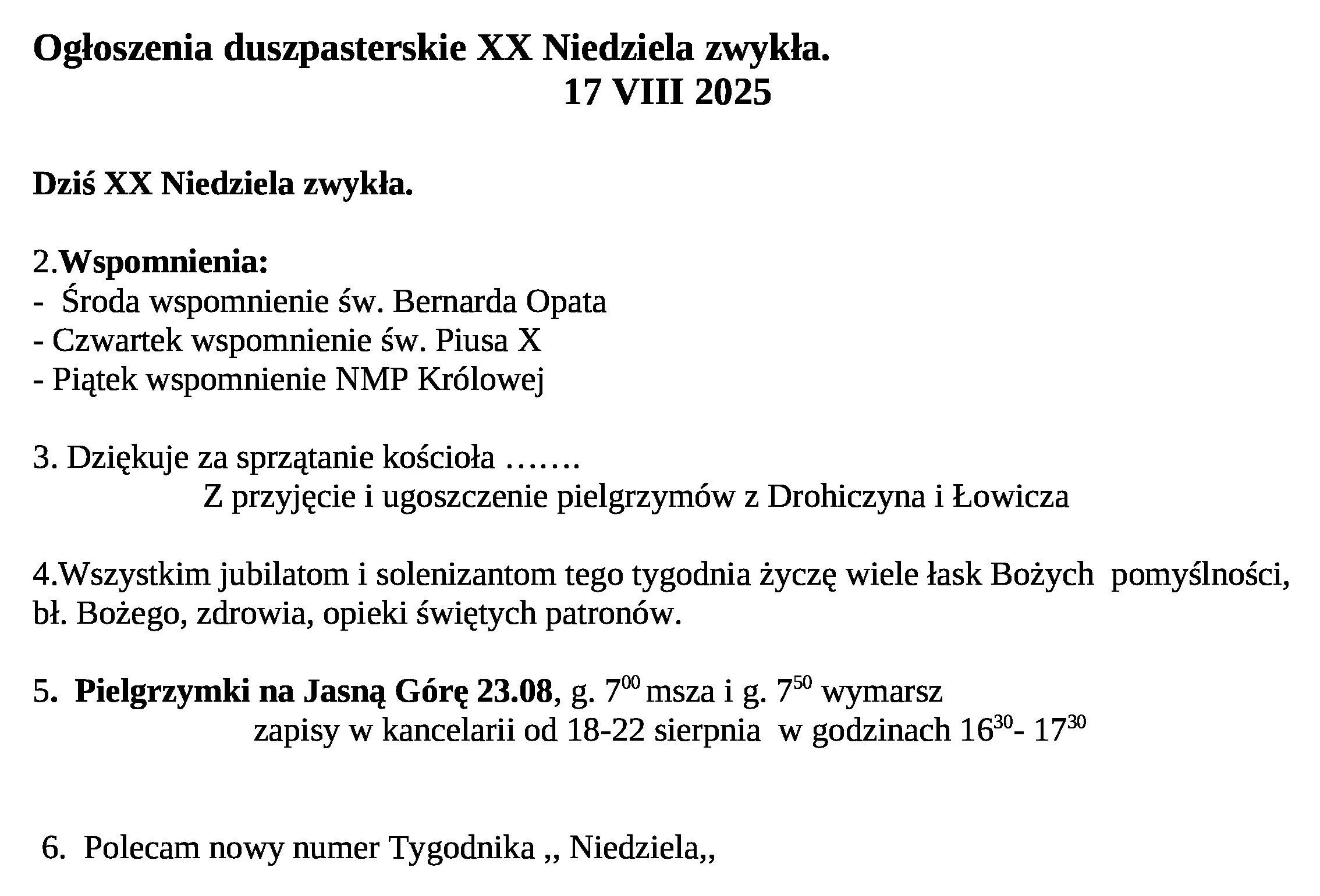 Ogłoszenia Duszpasterskie 17 sierpnia 2025