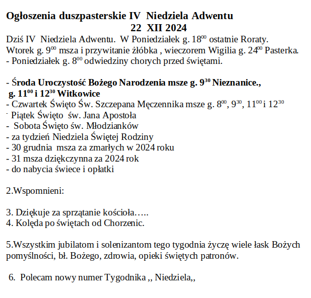 Ogłoszenia Duszpasterskie 22 XII 2024