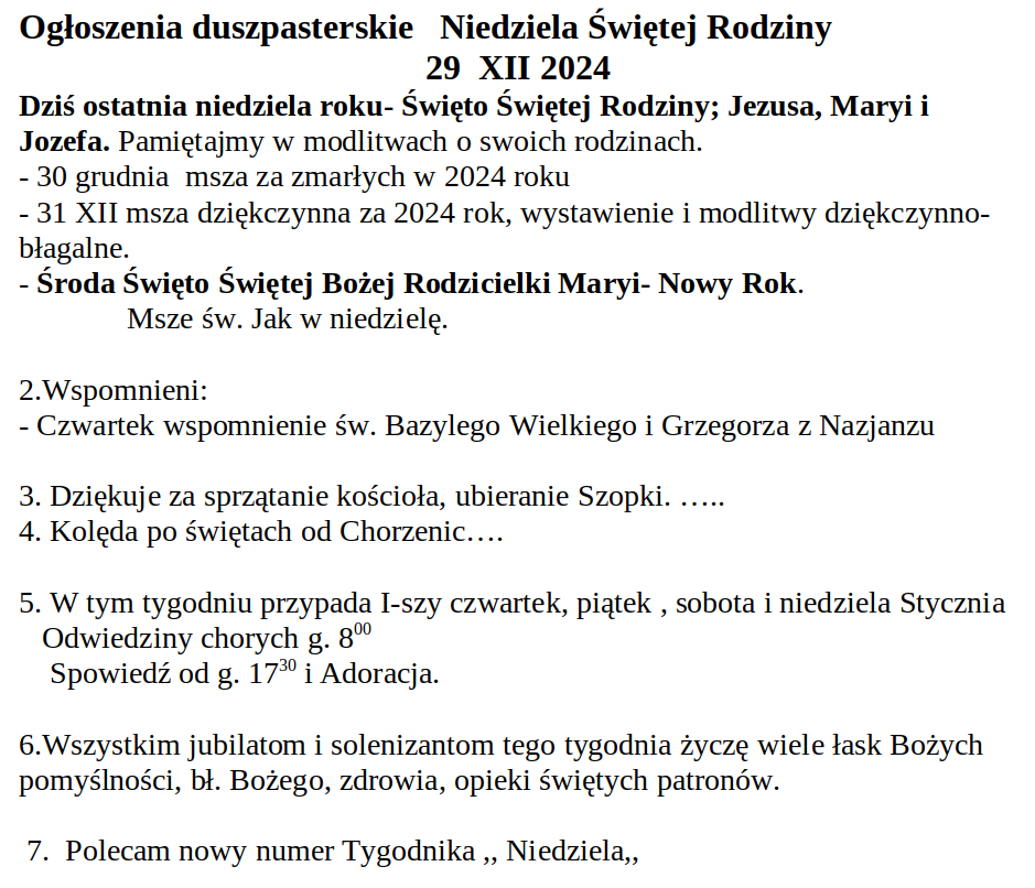 Ogłoszenia Duszpasterskie 29 XII 2024