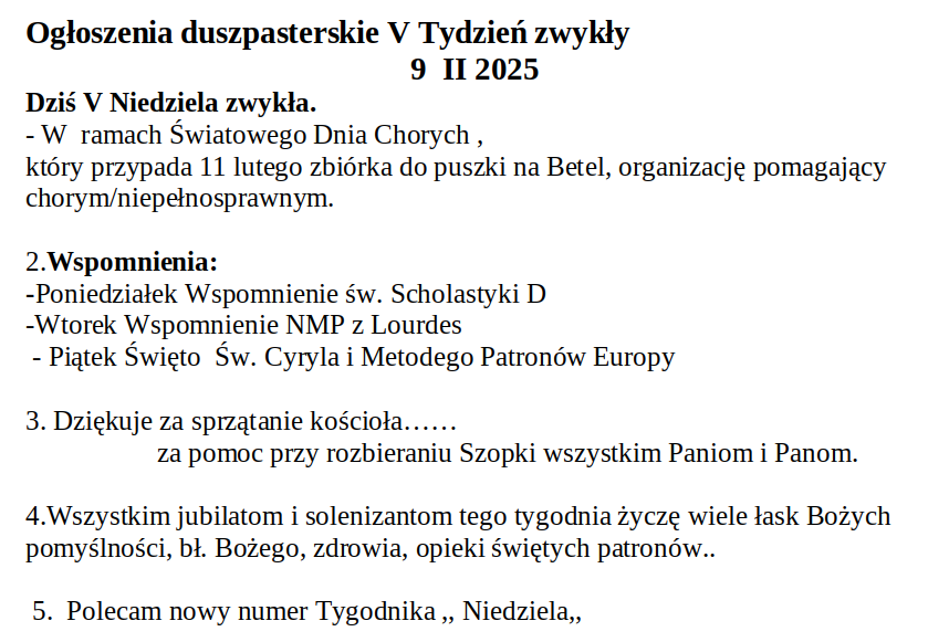 Ogłoszenia Duszpasterskie 9 lutego 2025
